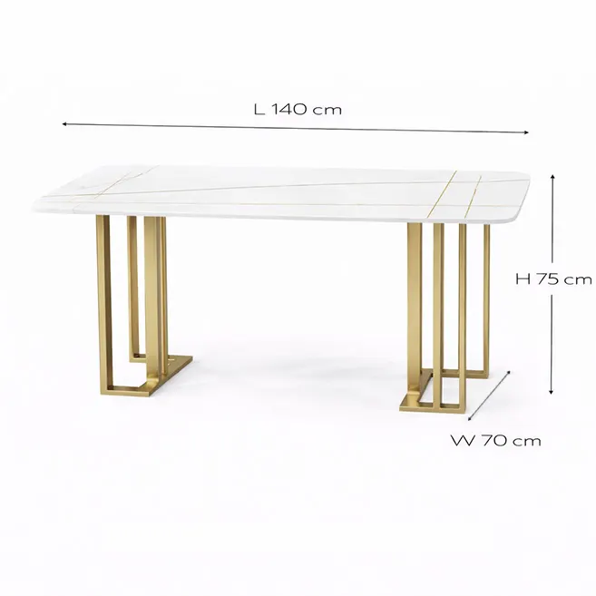 The Celestia Modern Marble Dining Table with Gold Metal Legs combines luxury and modern design in one elegant piece. Featuring a white marble-effect top with subtle grey veining and a geometric gold metal base, it creates a bold and sophisticated look. This 4-6 seater dining table offers a spacious surface, strong metal frame, and versatile use-perfect for dining rooms, offices, or modern interiors.