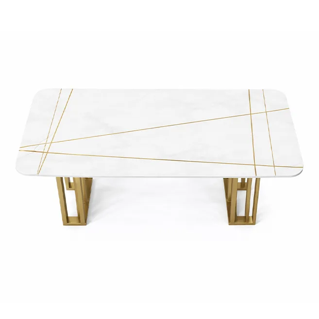 Sleek rectangular dining table with dual geometric gold leg frames