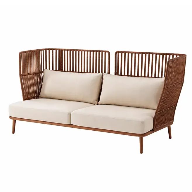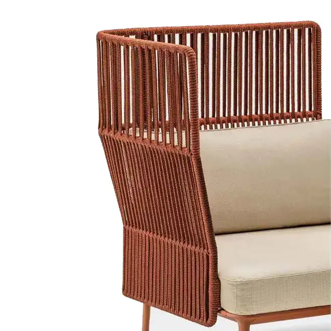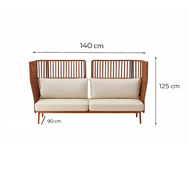Inspired by cocoon-style lounge seating, this 2-seater sofa features a high-back curved silhouette with vertical rope detailing. Its unique design serves as a modern statement piece, enhancing patios, gardens, balconies, boutique cafés, or indoor lounges with elegance and charm.
