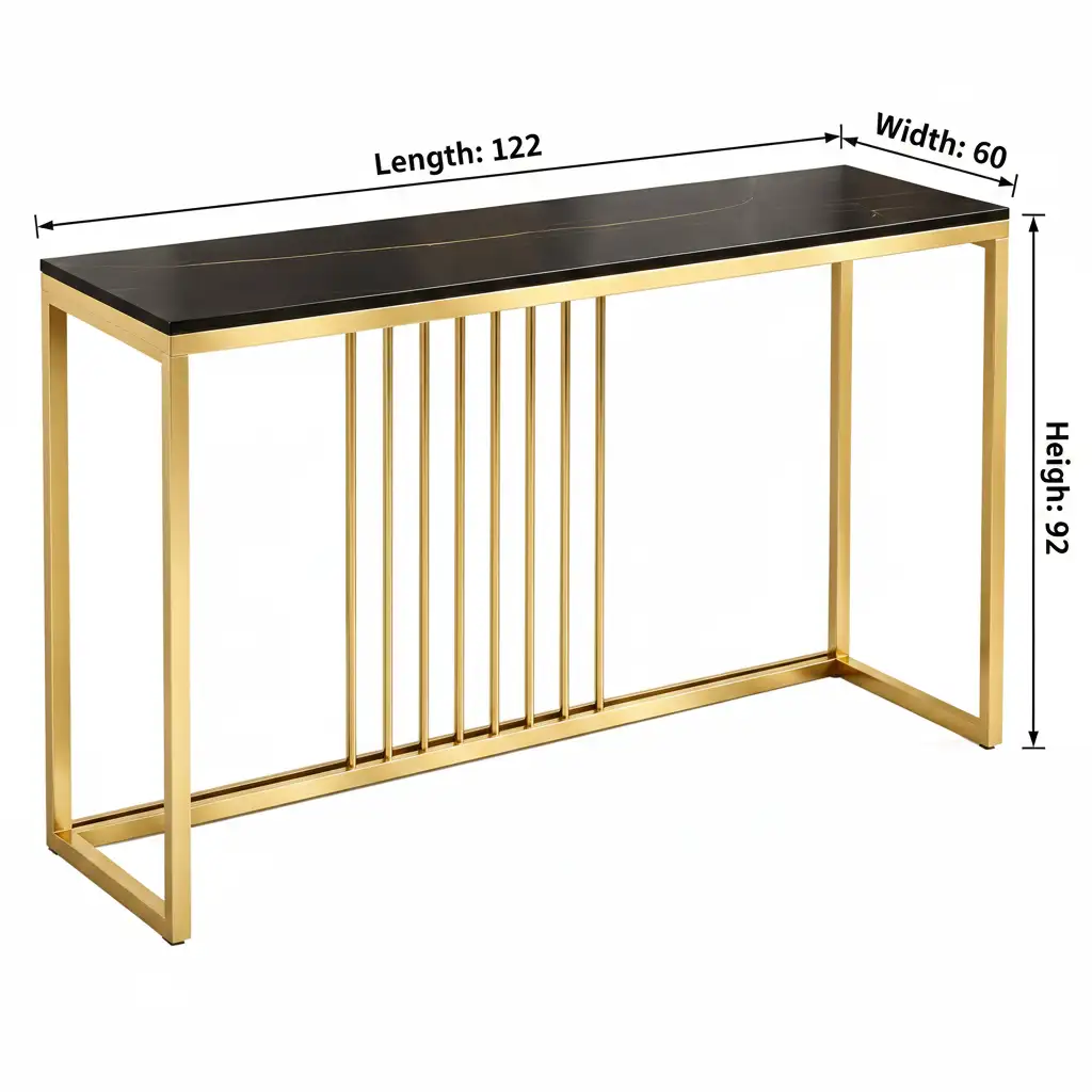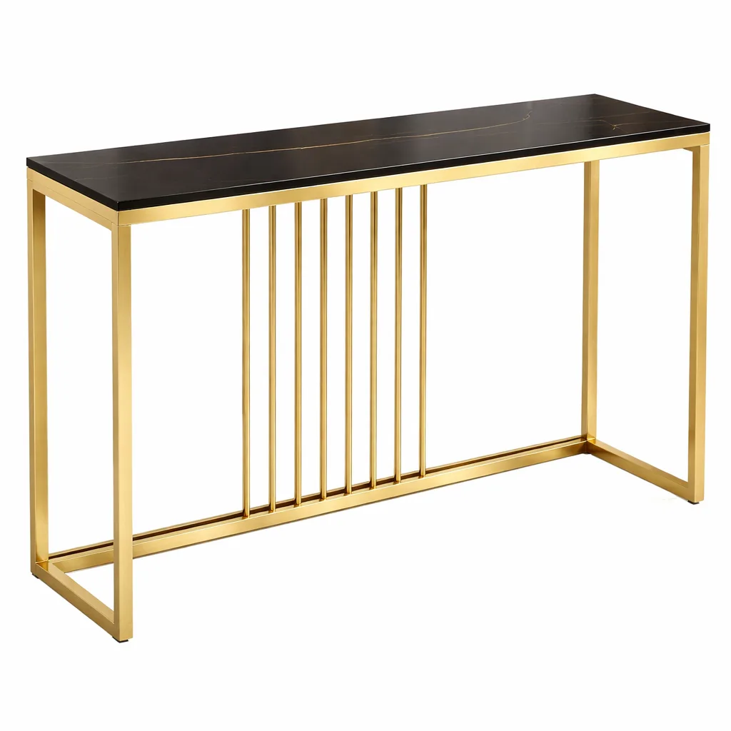 This console table is inspired by contemporary luxury and subtle Art Deco elements. It features a clean, structured frame with vertical stretcher rods at the center. These slim metal rods add a rhythmic and decorative touch. They also improve stability without making the design feel heavy. The open-frame structure keeps the look light, making it ideal for modern interiors.