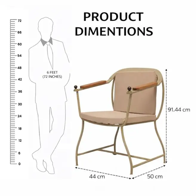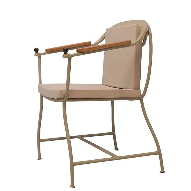 Unlike conventional chairs with separate backrests, the Courtyard Chair features a circular metal frame that gently cradles the back cushion. This integrated design keeps the cushion perfectly centered while providing ergonomic support, offering both comfort and a refined visual “frame” around the sitter.