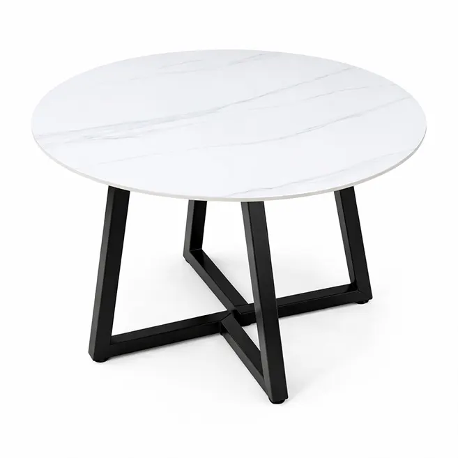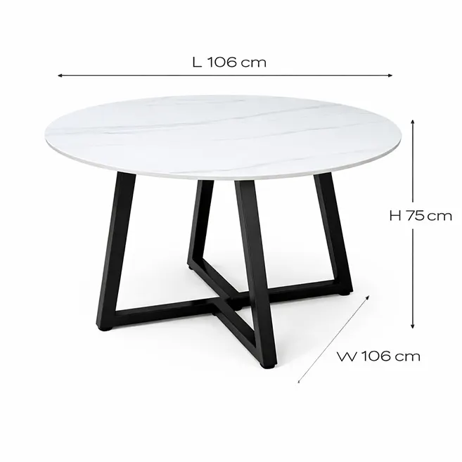 The Ivory Curve Modern Marble Dining Table with Iron Base combines modern design with everyday functionality. Featuring a white marble-effect top with soft grey veining and a bold X-shaped black metal base, it offers a stylish and sturdy dining solution. Its round shape saves space and creates a comfortable setting, perfect for dining areas, offices, or modern interiors.