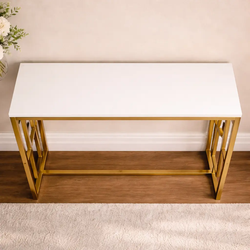 | Design | Minimalist luxury console table featuring a sleek rectangular top with a geometric open-frame base in a clean, modern gold finish |