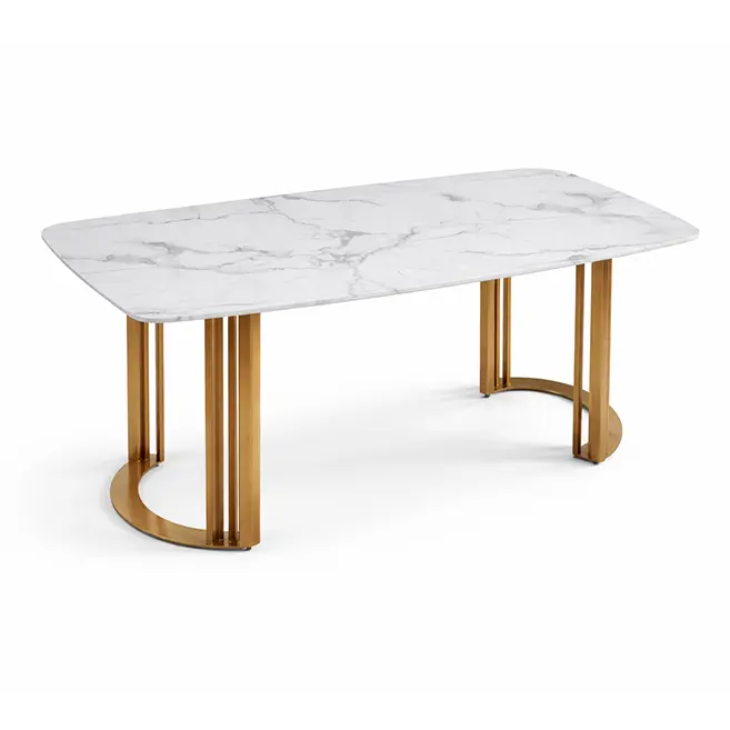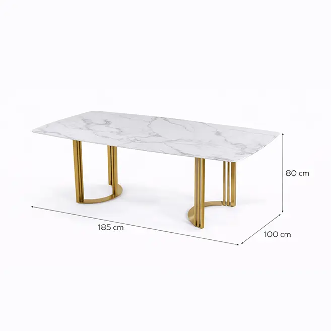 The sturdy iron base ensures excellent balance and load support, while the faux marble surface resists daily wear. Suitable for luxury homes, boutique restaurants, and upscale cafés, the Luxury Opulent Arc White Marble Dining Table, 6 Seater combines visual elegance with dependable performance.