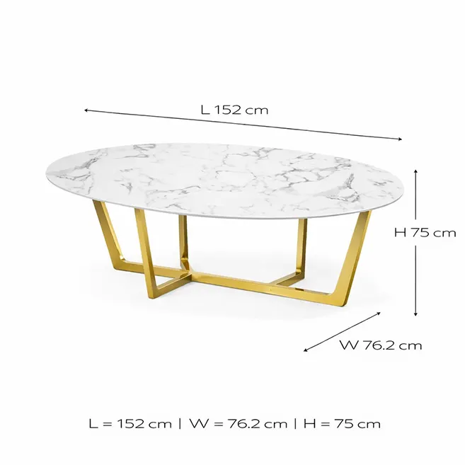 The Luxury Oval Marble Coffee Table with Gold Metal Base features a soft oval silhouette that eliminates sharp edges. This design makes it a safer option for homes with children or high-traffic areas.