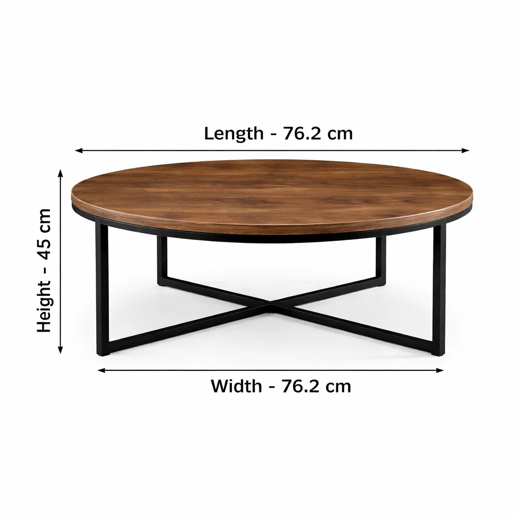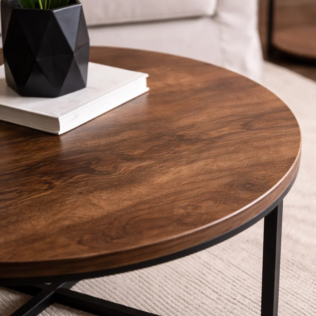 The circular tabletop not only softens the overall look of your seating area but also improves movement and flow within the room. Its rich wooden finish pairs seamlessly with the sleek black metal legs, offering a striking yet refined contrast. The criss-cross metal base adds a geometric touch, giving the table a contemporary edge while maintaining a minimalist aesthetic.