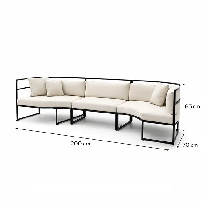 The powder-coated frame ensures resistance to rust, scratches, and daily wear, while the removable cushions make cleaning effortless. This combination of style, strength, and comfort makes the Oasis Arc Metal Sofa a standout piece in modern interiors or outdoor lounges.